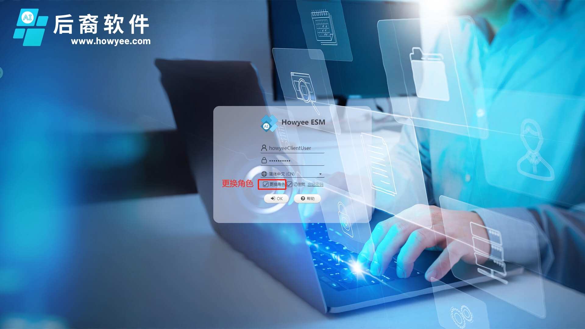 使用管理员提供的用户名和密码登录本系统,目前的账号由系统管理员统一分配,管理员的账号会在您购买Howyee ESM服务时通过电子邮件发送给您。这里需要注意Howyee ESM是支持多角色的,因此如果您的账号被管理员分配了多种角色(如果您只被分配了一种账号,请忽略更换角色部分的说明),则您需要通过登录时选择“更换角色”来进行登录角色的选择,每次登录只能以一种角色身份进行登录,您第一次登录成功后的角色会成为你今后登录系统的默认角色,如果你需要更换登录角色,可以在登录时再次选择“更换角色”或者登录成功后通过右上角“角色切换”按钮进行角色切换。以上操作您可以在我们提供的试用系统上进行测试。